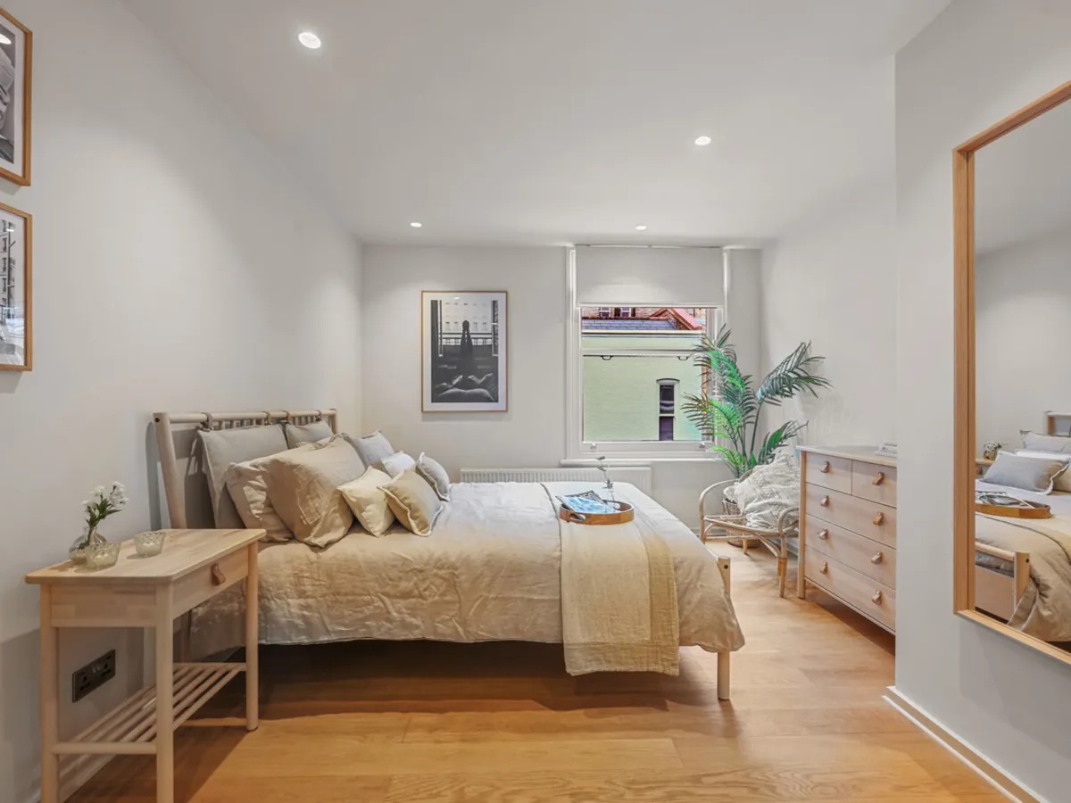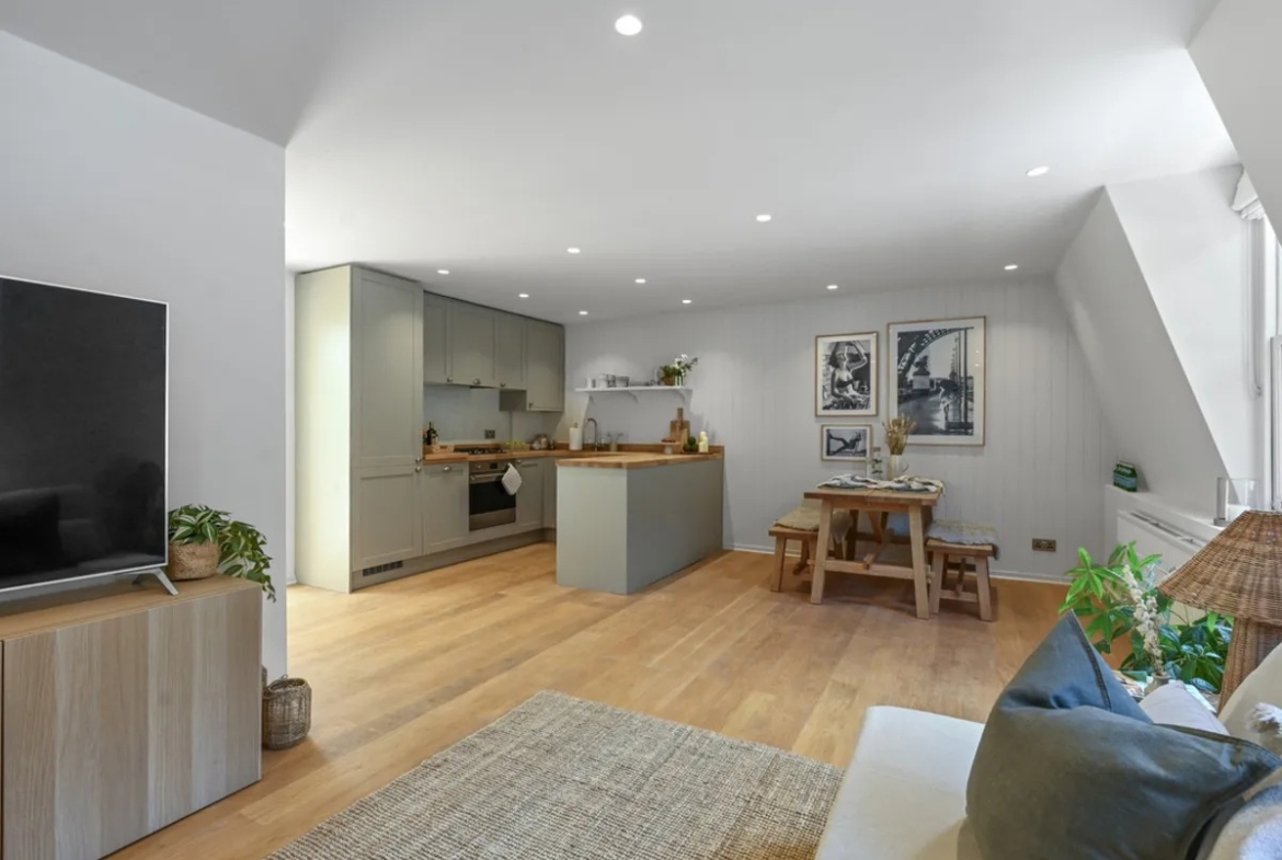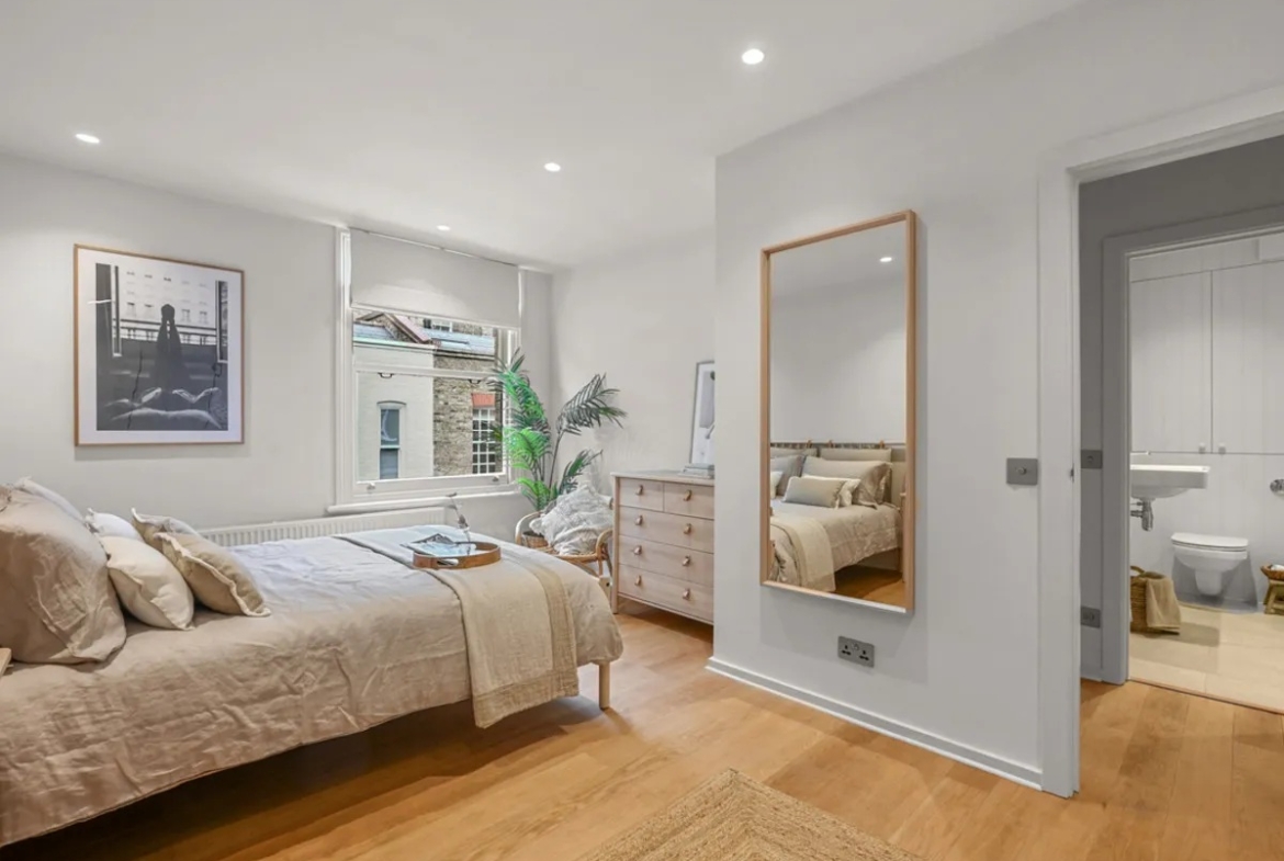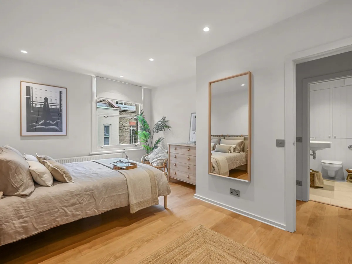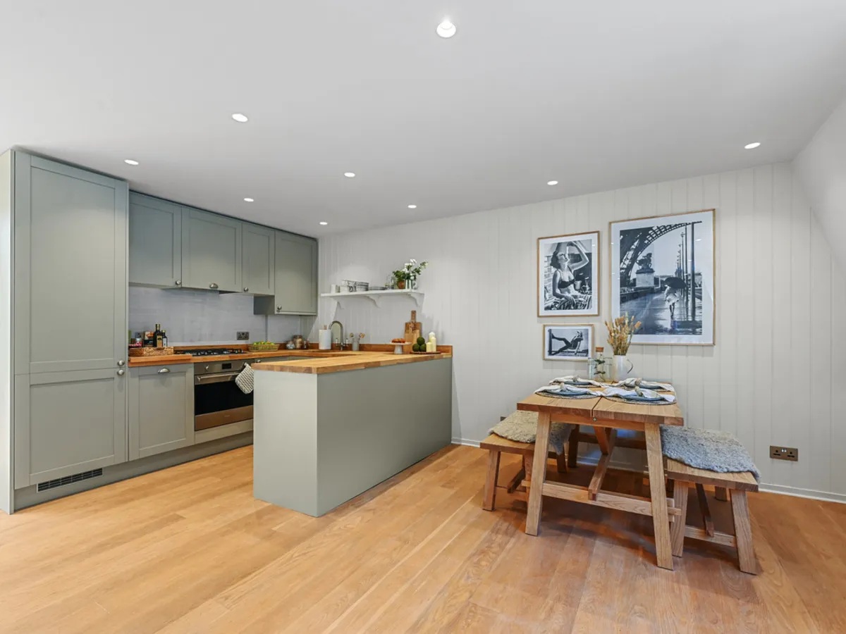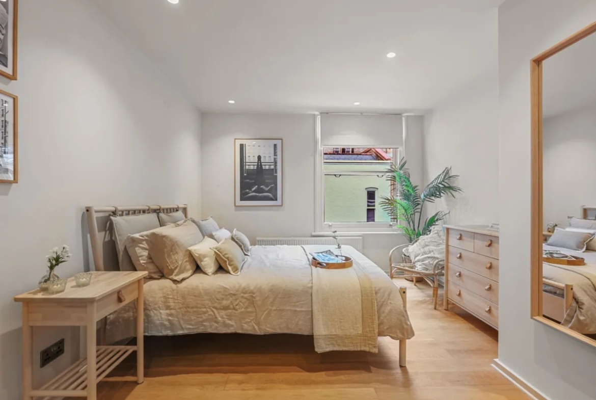 Occupying the top floor is a spacious open-plan kitchen and reception room, filled with natural light thanks to large windows and offering plenty of space for dining and entertaining.The lower level features two well-sized double bedrooms, both with built-in storage, along with two sleek, contemporary bathrooms one of which is en suite.