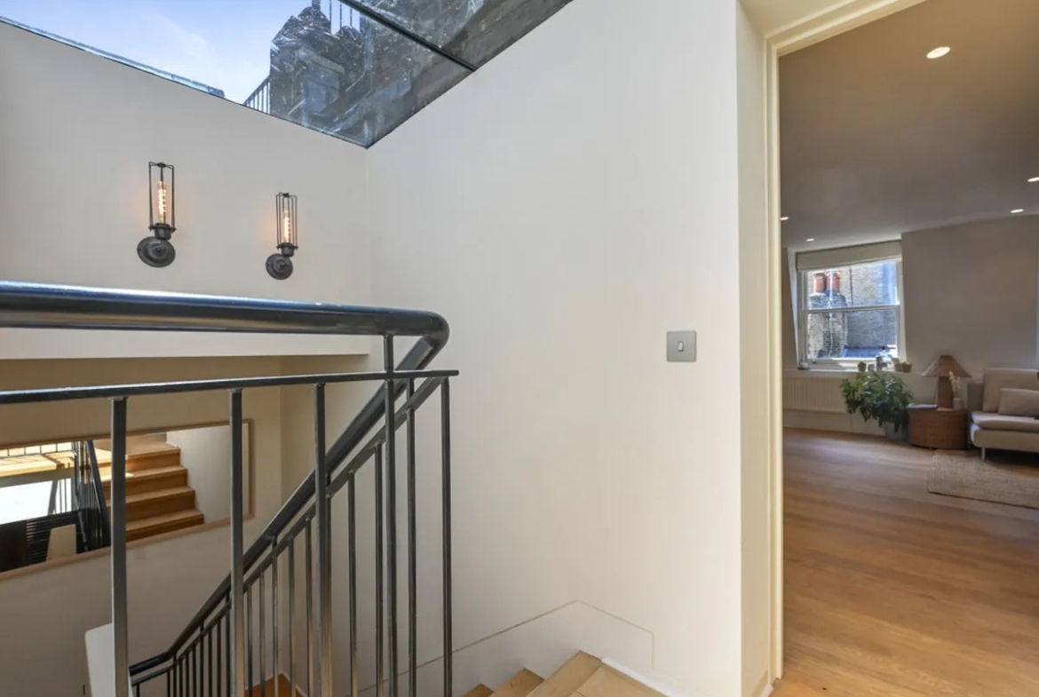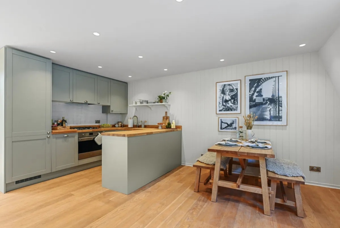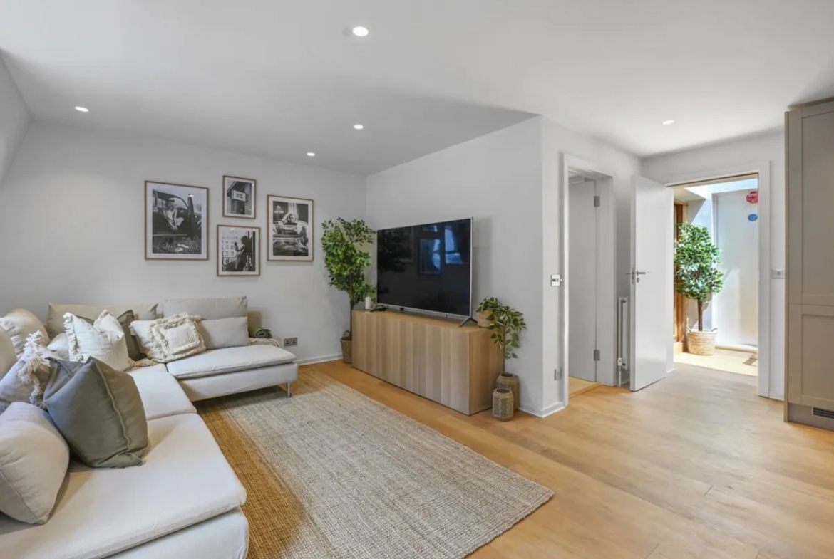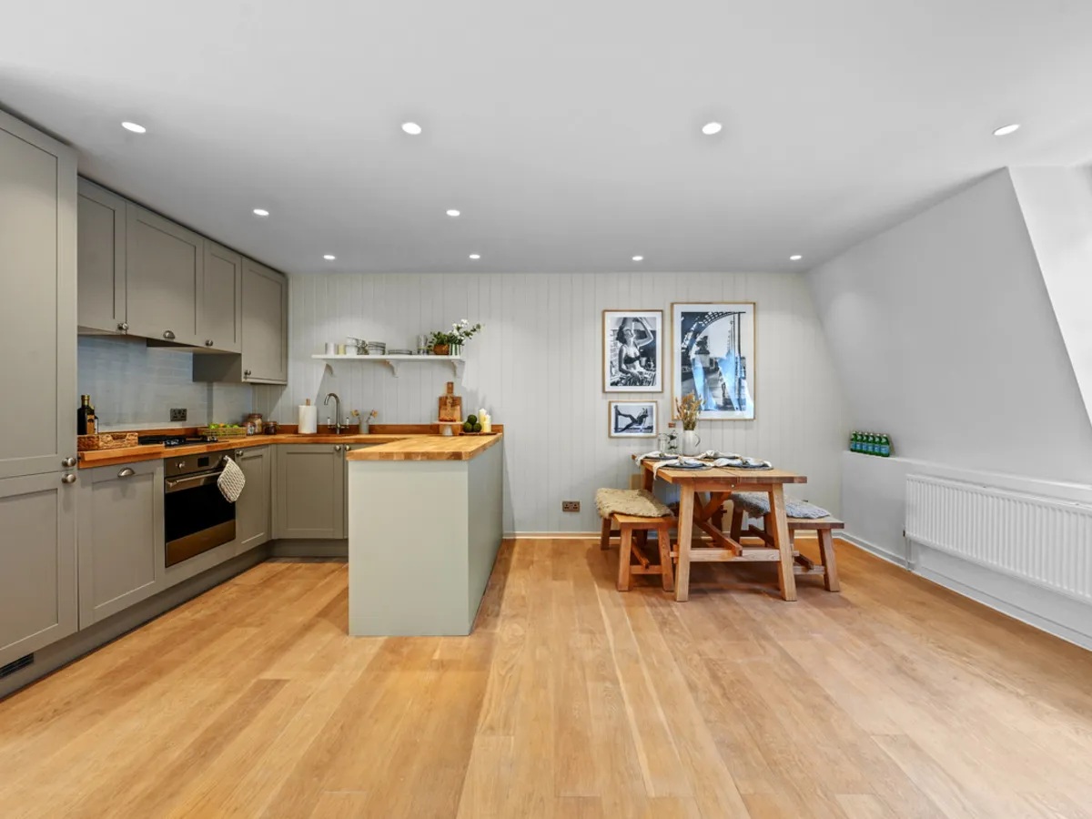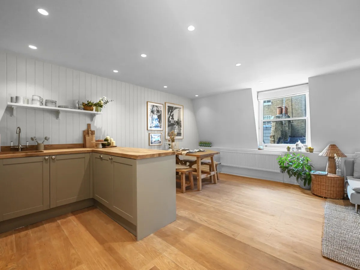 Occupying the top floor is a spacious open-plan kitchen and reception room, filled with natural light thanks to large windows and offering plenty of space for dining and entertaining.The lower level features two well-sized double bedrooms, both with built-in storage, along with two sleek, contemporary bathrooms one of which is en suite.