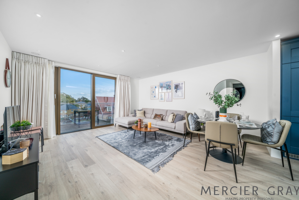 Measuring 848 sq ft, the apartment offers a spacious 23 ft open-plan living, kitchen and dining area with floor-to-ceiling windows, leading onto a private balcony with views across beautifully landscaped communal gardens.The principal bedroom includes bespoke fitted wardrobes and a dressing area, while the second bedroom is also a generous double. A stylish, fully tiled bathroom with overhead shower, concealed storage and premium finishes adds to the sense of luxury. The property also benefits from two hallway cupboards, including a utility cupboard, ensuring excellent storage throughout.