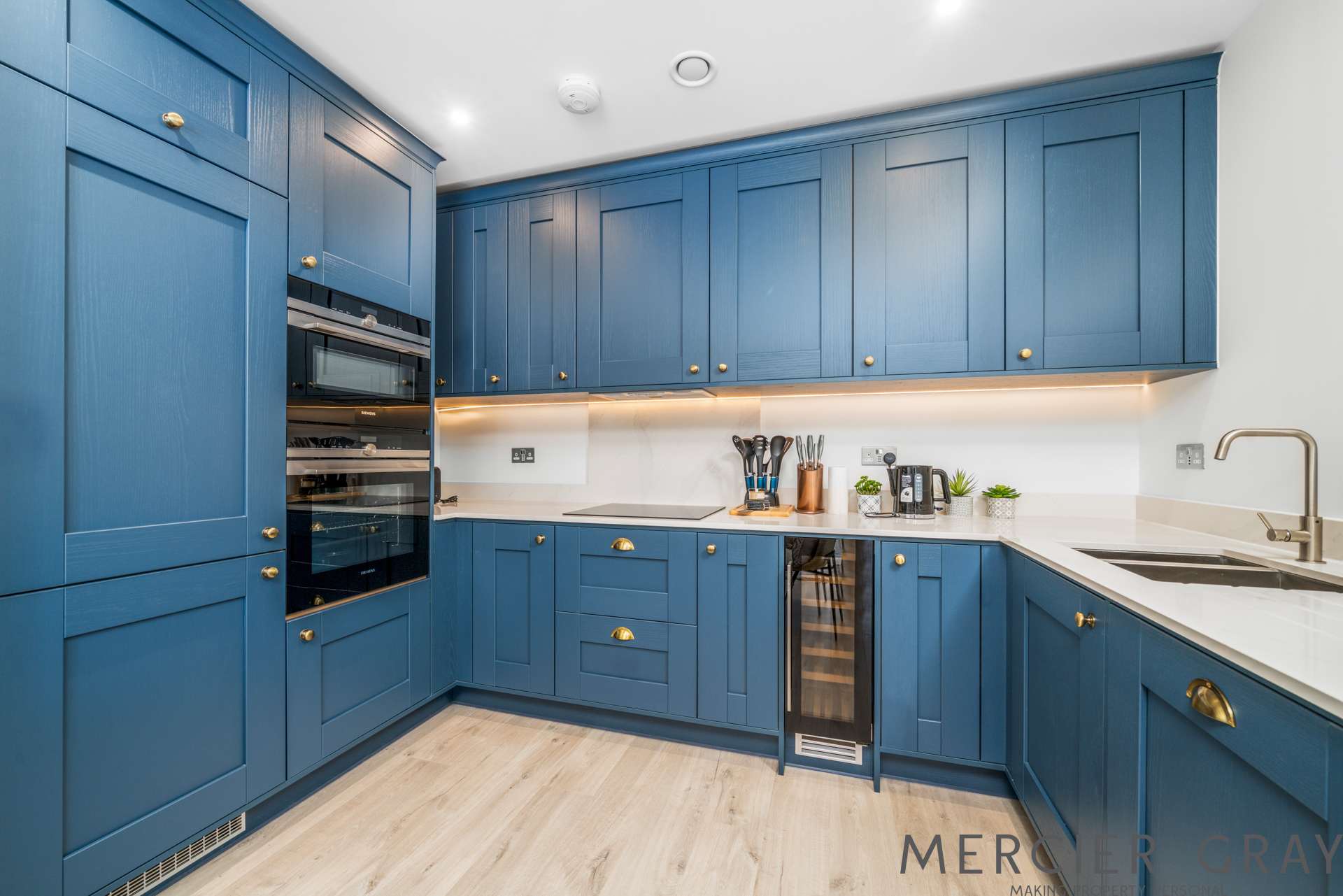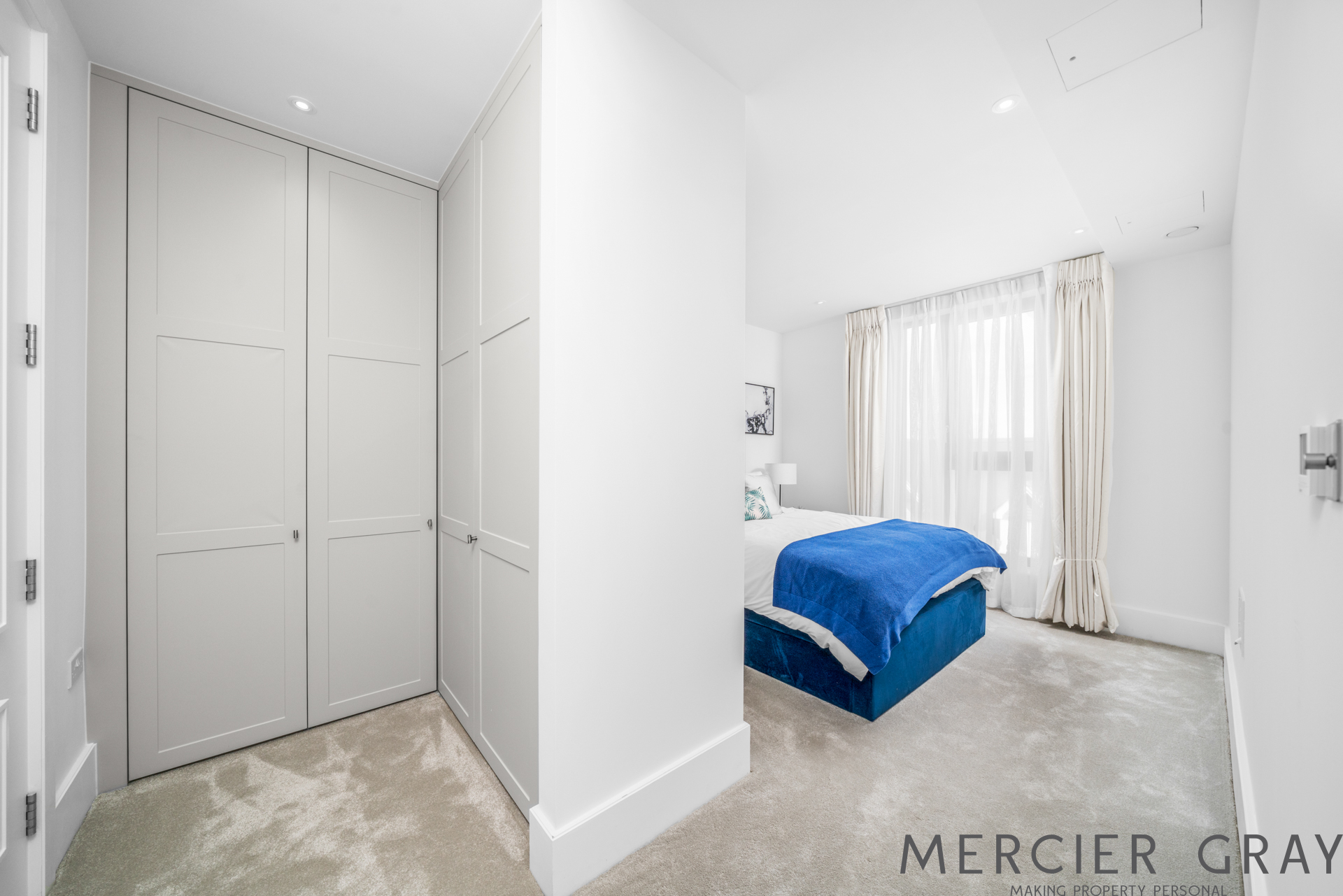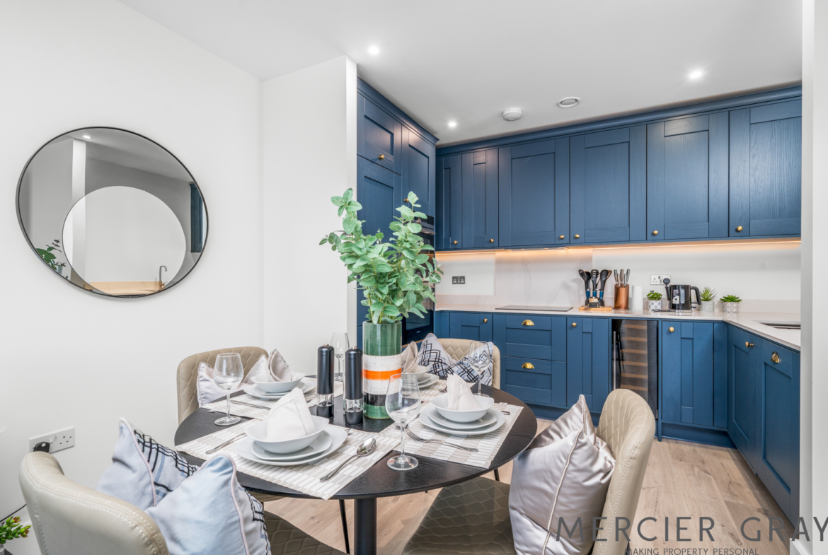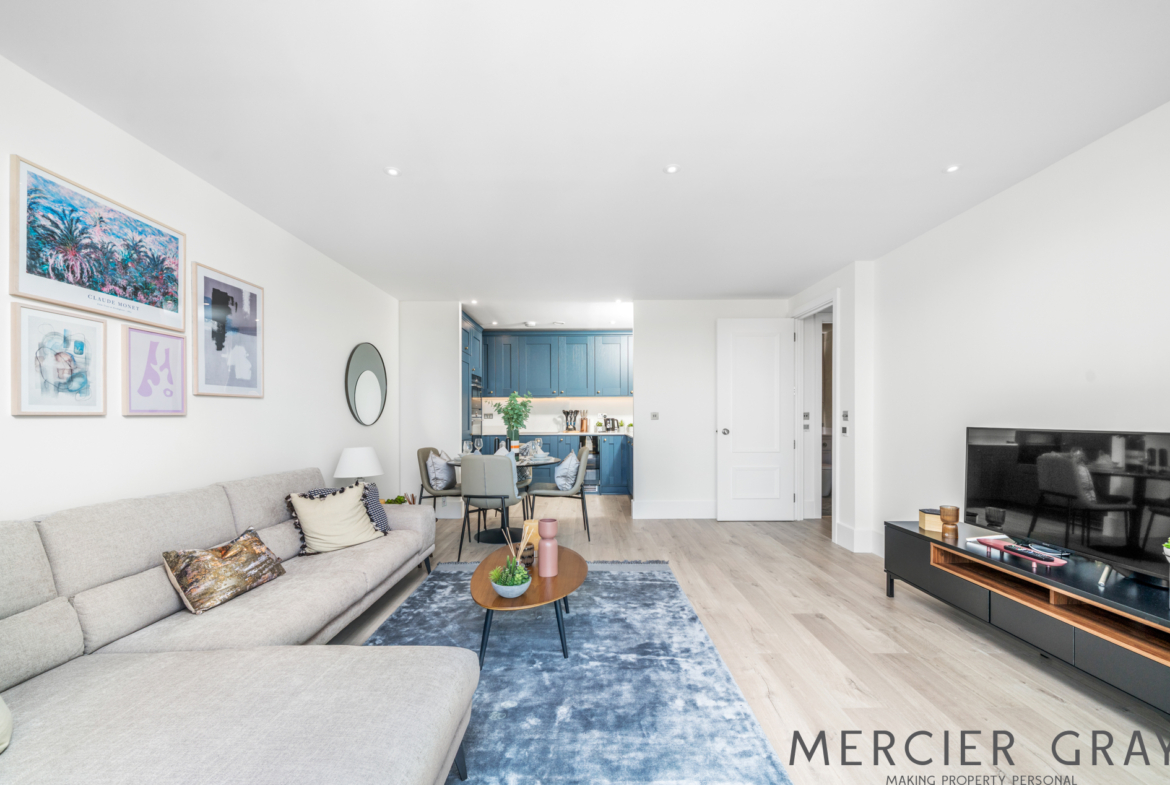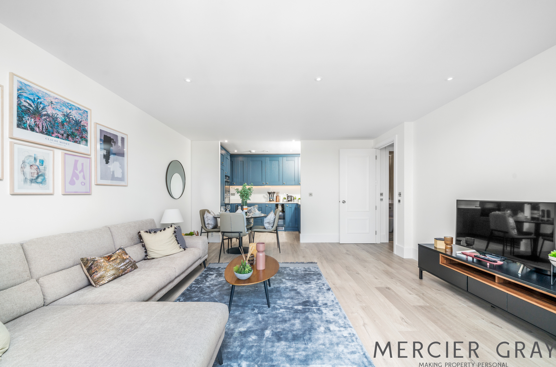 Measuring 848 sq ft, the apartment offers a spacious 23 ft open-plan living, kitchen and dining area with floor-to-ceiling windows, leading onto a private balcony with views across beautifully landscaped communal gardens.The principal bedroom includes bespoke fitted wardrobes and a dressing area, while the second bedroom is also a generous double. A stylish, fully tiled bathroom with overhead shower, concealed storage and premium finishes adds to the sense of luxury. The property also benefits from two hallway cupboards, including a utility cupboard, ensuring excellent storage throughout.