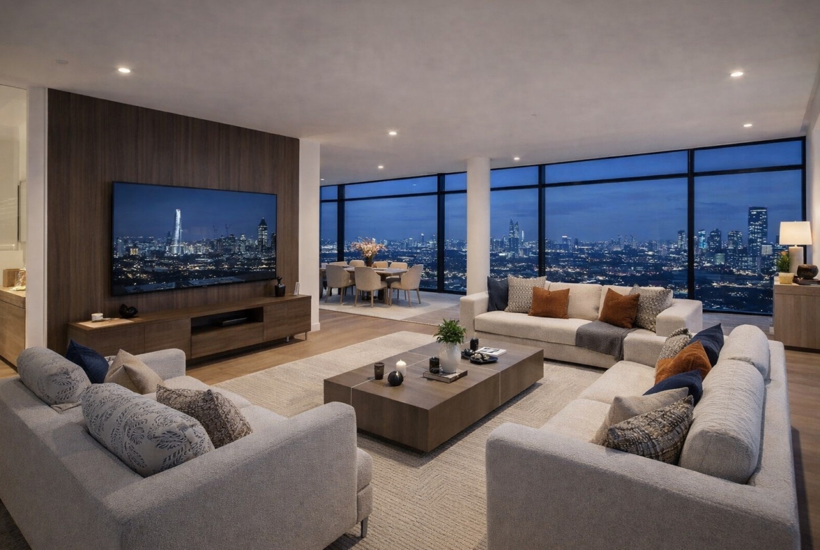 Presenting a rare opportunity to acquire a spectacular duplex penthouse, defined by its striking design, exceptional proportions, and breathtaking panoramic views across Londons skyline. Floor-to-ceiling glazing floods the interiors with natural light, creating a bright and expansive living environment throughout.