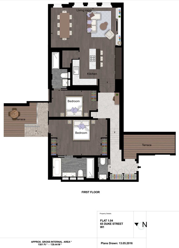 This spectacular, interior designed two-bedroom, north west facing, split level Mayfair apartment with two private terraces, is located on Duke Street, just off Oxford Street.
