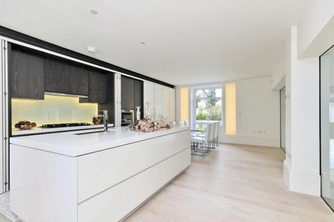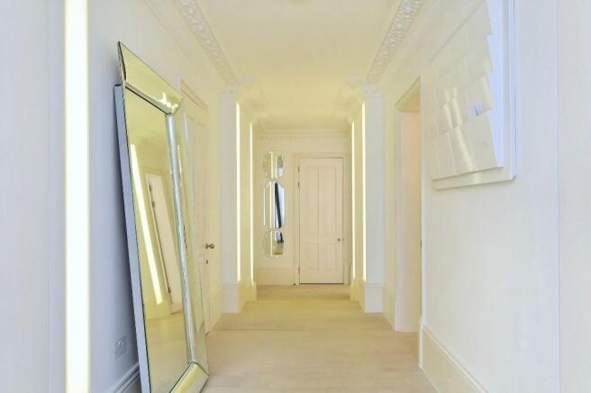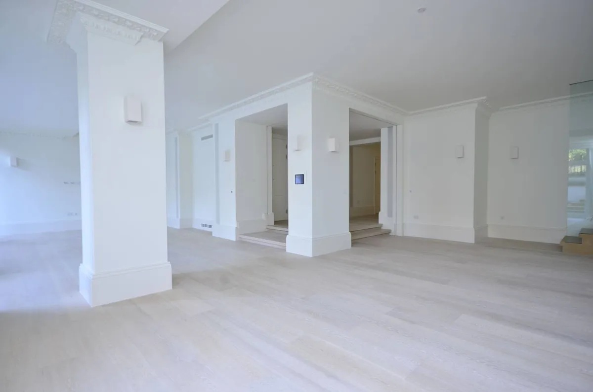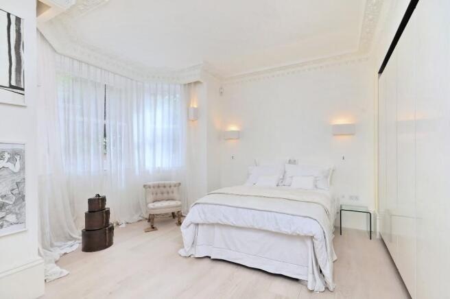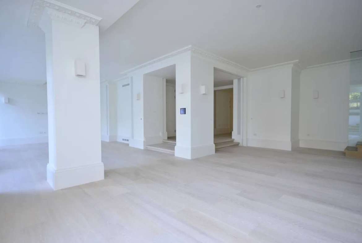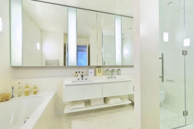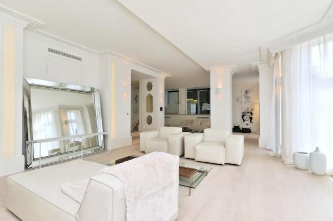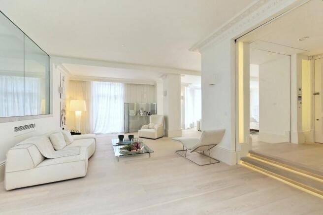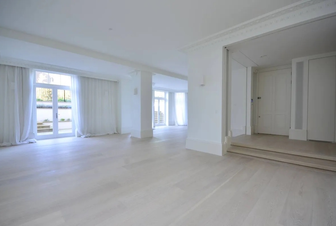 The property features a spacious double-height reception room, a designer kitchen concealed behind elegant folding-pocket doors, and three double bedrooms, each with its own en-suite bathroom. The principal suite provides a luxurious retreat with bespoke finishes and generous storage.Residents benefit from a range of premium amenities, including an on-site porter, lift access, secure underground parking for two cars, and access to communal gardens.