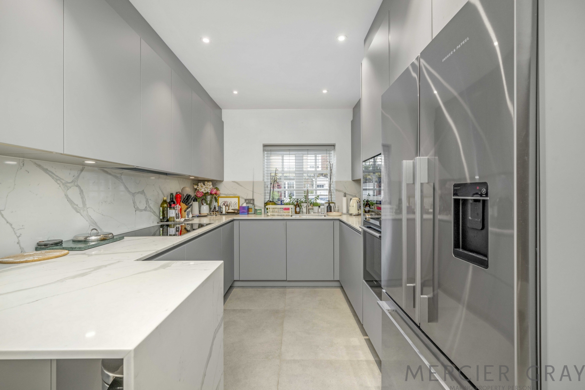 Spanning four floors, the home offers spacious living areas, including a private decked patio, access to a shared garden, and parking for two cars. The layout features a large kitchen with direct entry to the patio, a rear-facing reception room on the ground floor, four well-proportioned bedrooms, a guest bedroom or office, two en-suite shower rooms, a family bathroom, a guest WC, and a separate utility room.