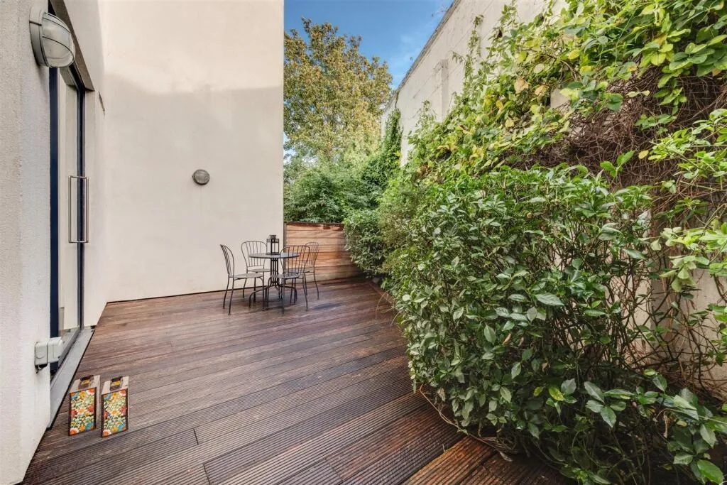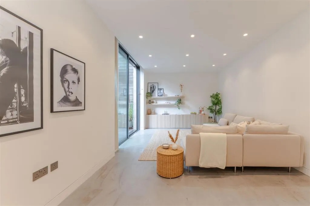 The home features expansive floor-to-ceiling windows, polished concrete floors, and underfloor heating, complemented by a generous private decked terrace. The open-plan kitchen and reception room create an ideal space for entertaining, while the principal bedroom benefits from a walk-in wardrobe and a stylish en-suite bathroom.