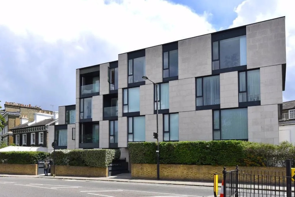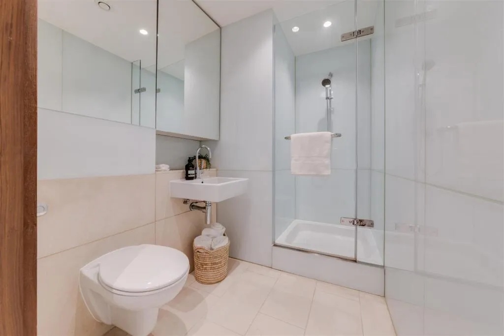A beautifully crafted two-bedroom, two-bathroom apartment set within a striking modern development, offering a sleek and contemporary aesthetic.