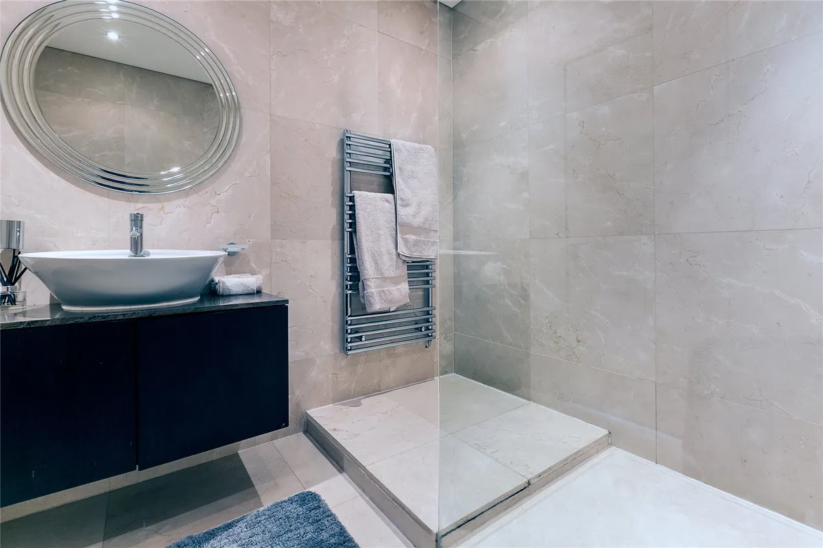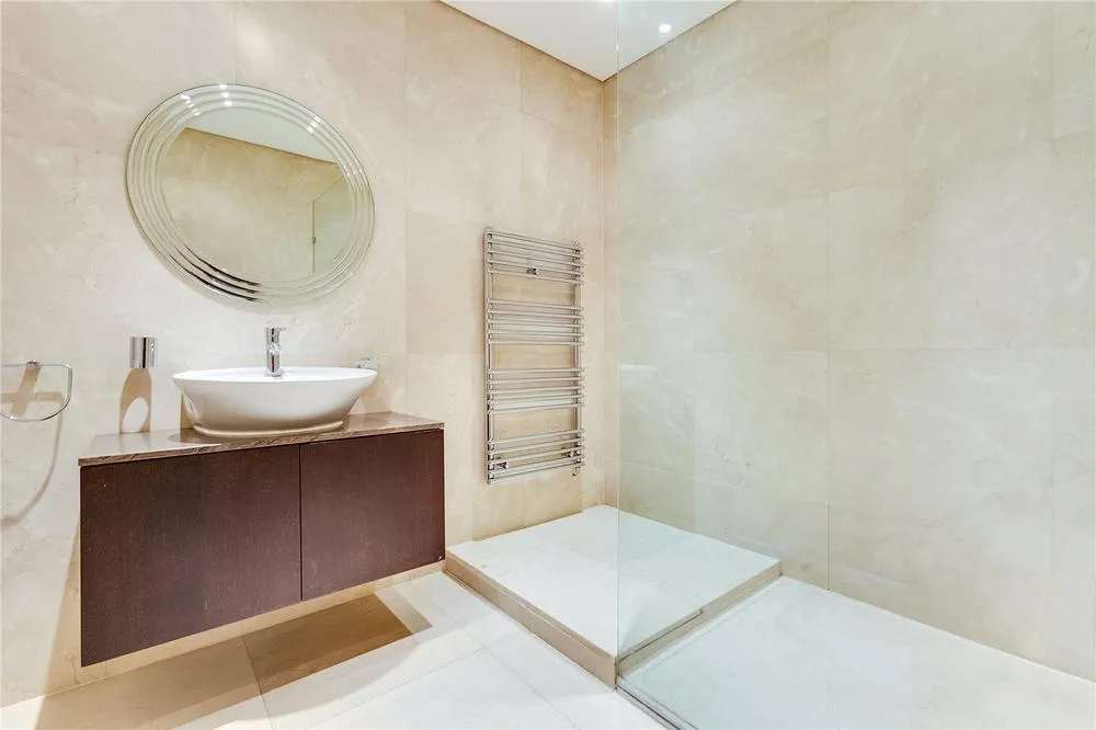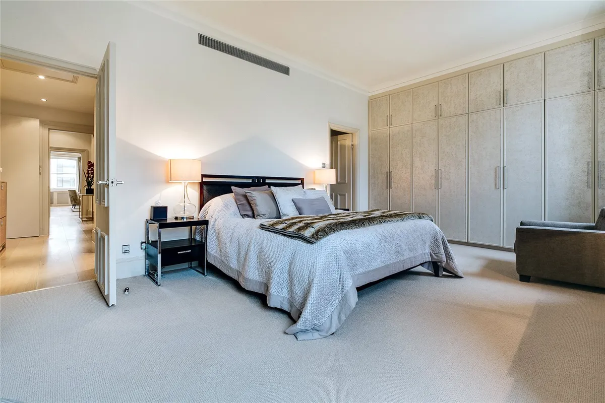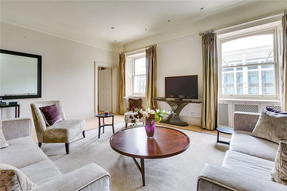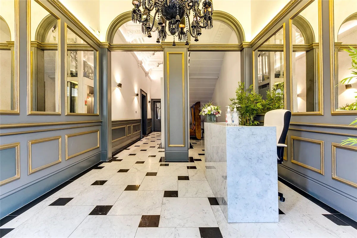 The accommodation comprises an open plan reception room with grand ceiling heights, a separate eat-in modern kitchen and storage space. There are three double bedrooms including a large master bedroom suite with an en-suite bathroom and fitted wardrobes, two further guest bedrooms, one with en suite, an additional family bathroom. Further benefits include air conditioning, an integrated sound system and day porter.