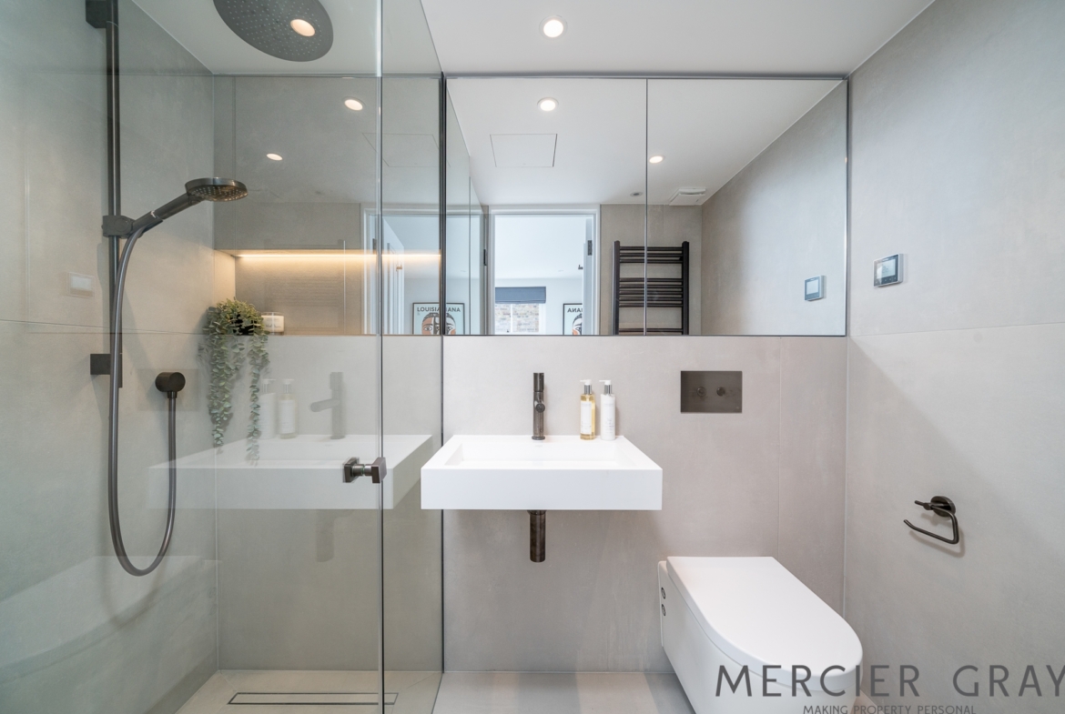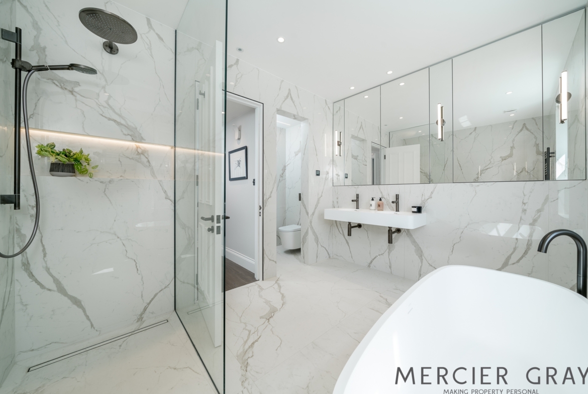 A beautifully crafted open-plan living space features an Italian Aster Cucine kitchen with Spekva wooden worktops, and oak flooring. Thoughtful details ambient lighting, a bioethanol fireplace, and underfloor heating create a warm, refined atmosphere throughout. All bedrooms are spacious doubles, with the principal suite offering a walk-through wardrobe and a marble-clad bathroom with Lusso stone and Axor finishes. Air conditioning and black oak accents add to the homes sophisticated aesthetic.