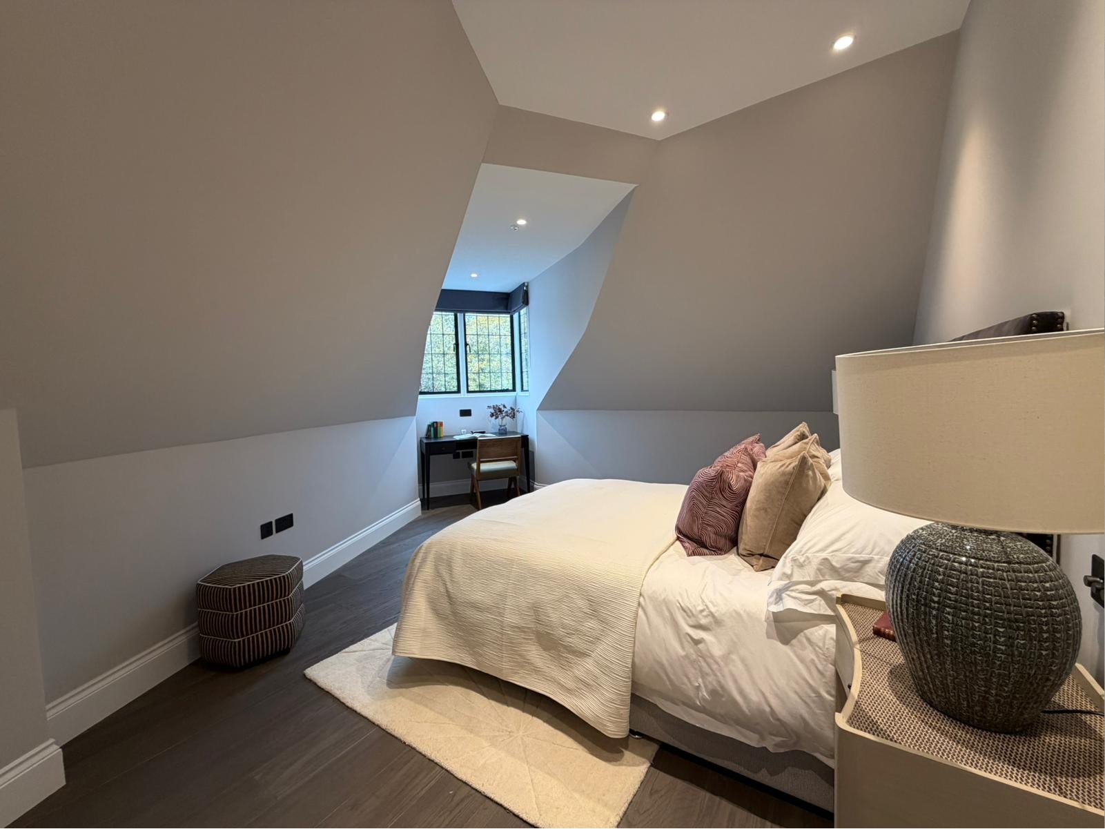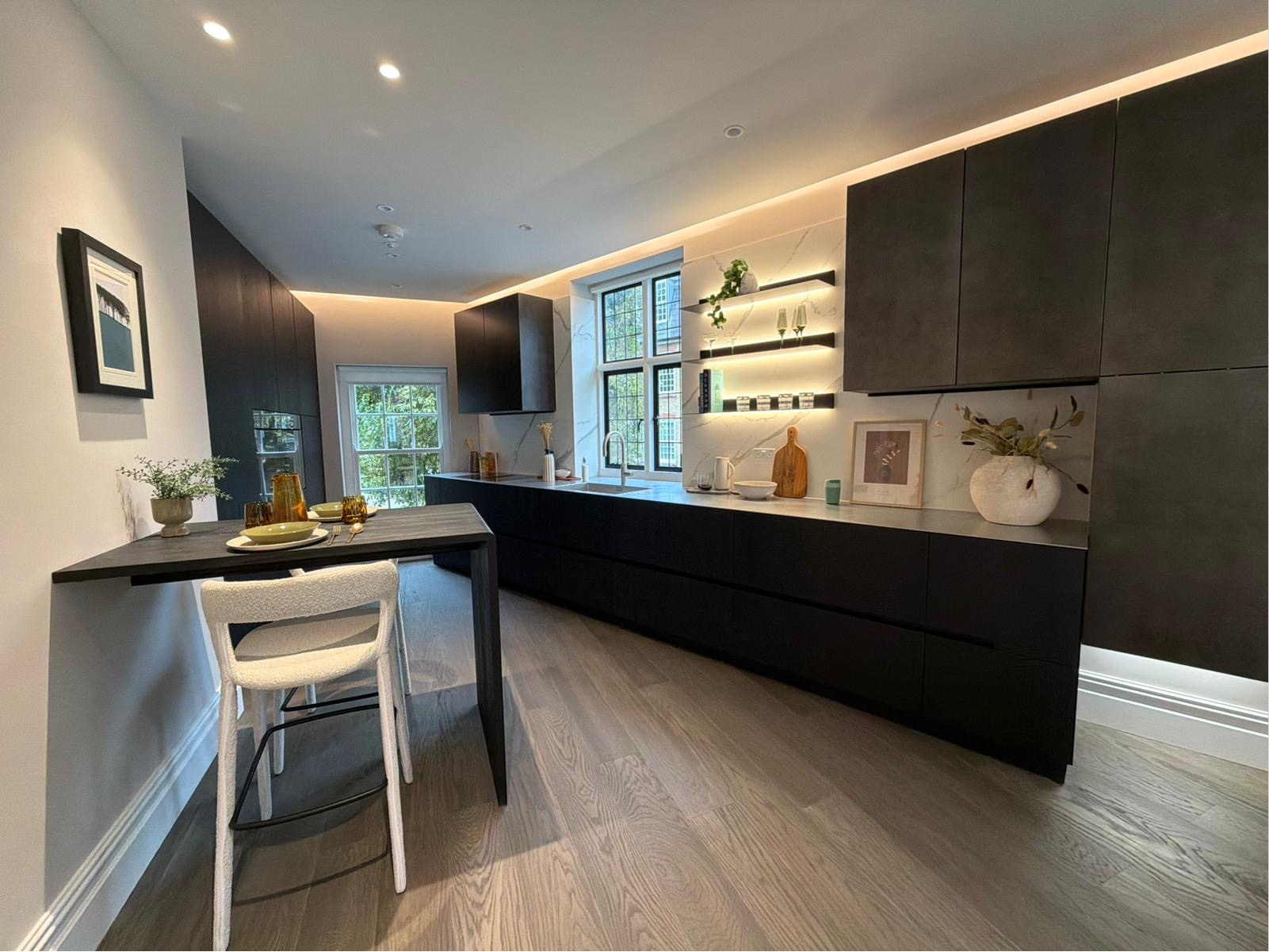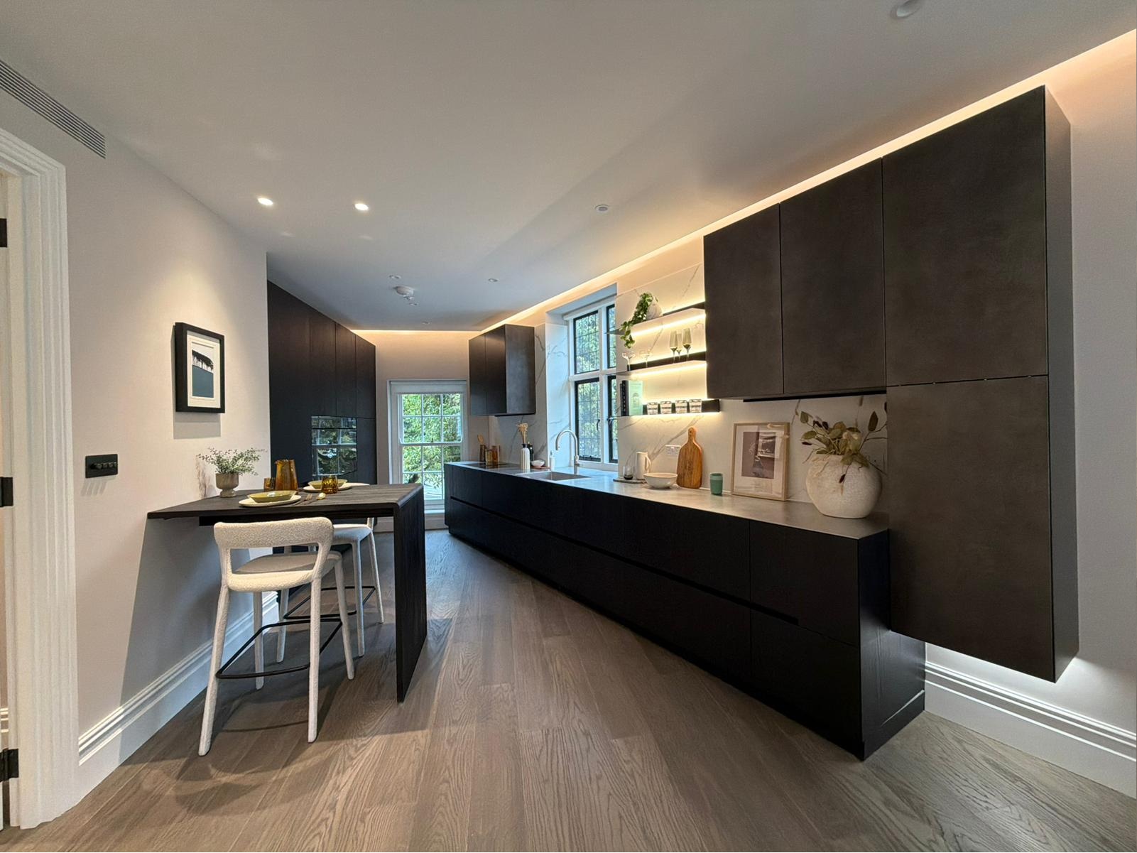 A beautifully crafted open-plan living space features an Italian Aster Cucine kitchen with Spekva wooden worktops, and oak flooring. Thoughtful details ambient lighting, a bioethanol fireplace, and underfloor heating create a warm, refined atmosphere throughout. All bedrooms are spacious doubles, with the principal suite offering a walk-through wardrobe and a marble-clad bathroom with Lusso stone and Axor finishes. Air conditioning and black oak accents add to the homes sophisticated aesthetic.