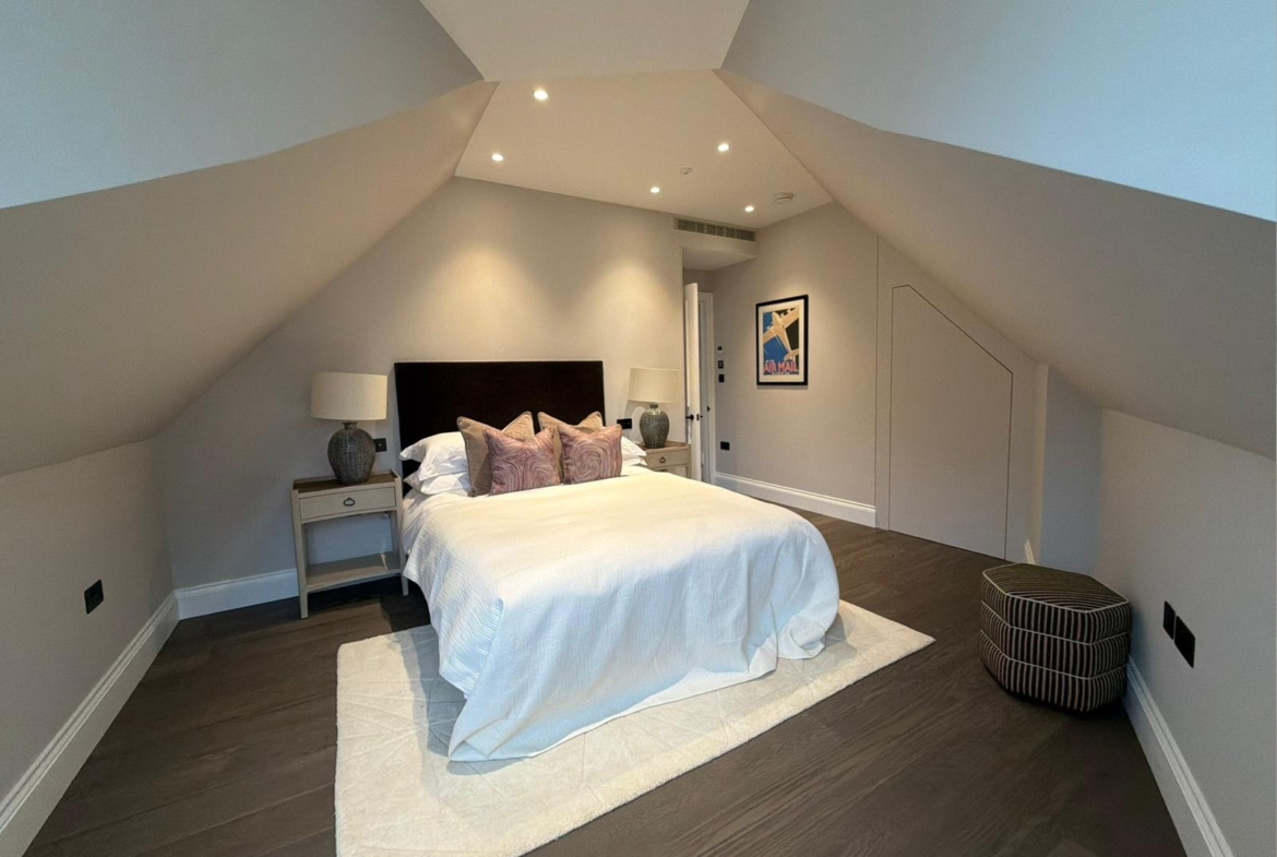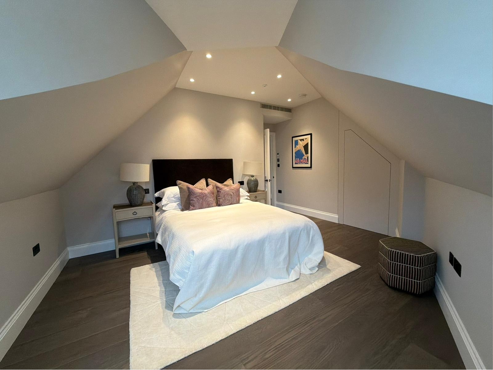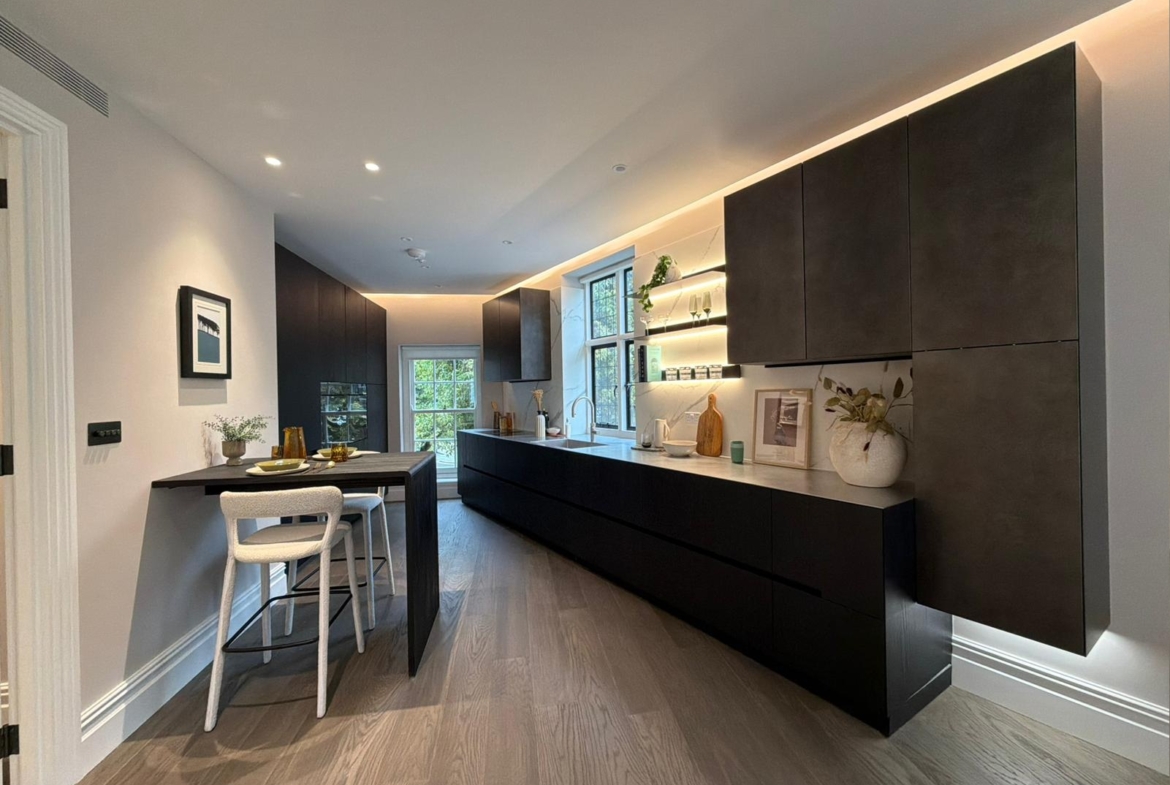 A beautifully crafted open-plan living space features an Italian Aster Cucine kitchen with Spekva wooden worktops, and oak flooring. Thoughtful details ambient lighting, a bioethanol fireplace, and underfloor heating create a warm, refined atmosphere throughout. All bedrooms are spacious doubles, with the principal suite offering a walk-through wardrobe and a marble-clad bathroom with Lusso stone and Axor finishes. Air conditioning and black oak accents add to the homes sophisticated aesthetic.