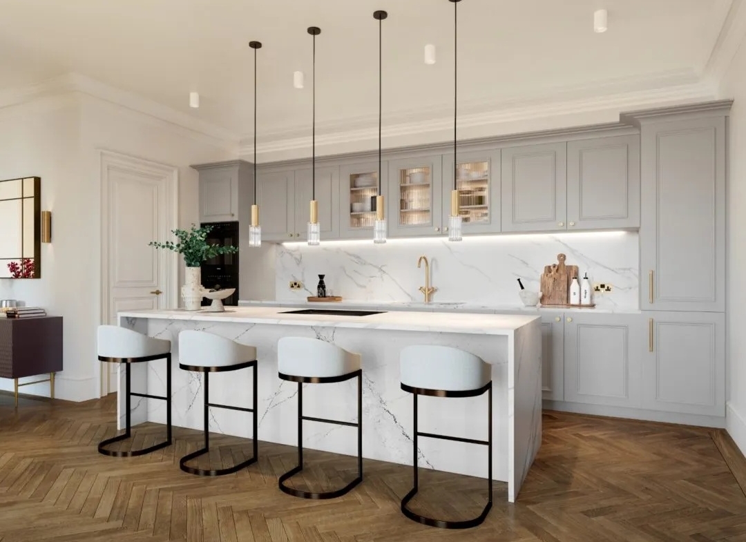 The lower level is arranged around a bright open-plan reception and dining space, enjoying lovely views across the lake and surrounding parkland. The kitchen is fitted with custom cabinetry and high-quality appliances, making it ideal for both hosting and everyday living. A spacious second bedroom with its own en suite is also located on this floor. The upper level is home to the principal bedroom suite, which offers fitted wardrobes and a beautifully appointed en suite bathroom. There is also an additional main bathroom featuring a bath. Lift access serves the apartment, adding ease and practicality. Residents benefit from exclusive access to the Reading Room, a private residents’ space designed for quiet relaxation. Throughout the apartment, features such as herringbone flooring, tall ceilings and carefully chosen finishes enhance the sense of quality and elegance.Formerly a prestigious residence for royalty and high society, the Mansion House has been meticulously restored into just 14 luxury homes by Berkeley, each reflecting exceptional craftsmanship.