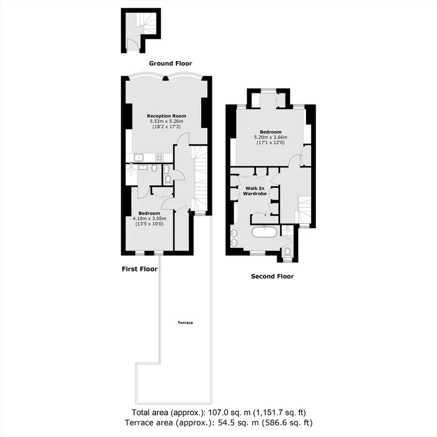 Finished to the highest standard throughout, the property boasts a spacious reception room, two generously sized bedrooms, two modern bathrooms, a large room used for a walk in wardrobe and en-suite, and a large private terrace.